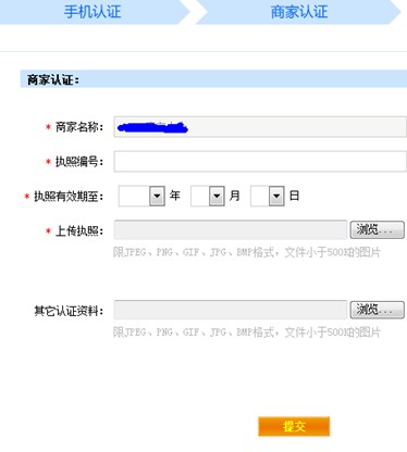 其中商家名称为默认(不需要填写), 其他带*的为必填项,填写完成之后点击提交。此时您的信息会显示为审核中,如图: