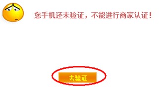 ④点击认证之后会跳出(您手机还未验证,不能进行商家认证)提示页面,如图: